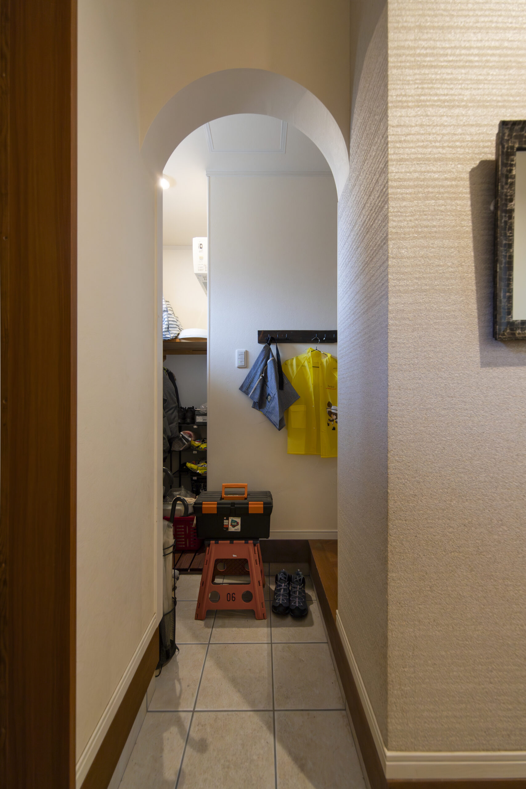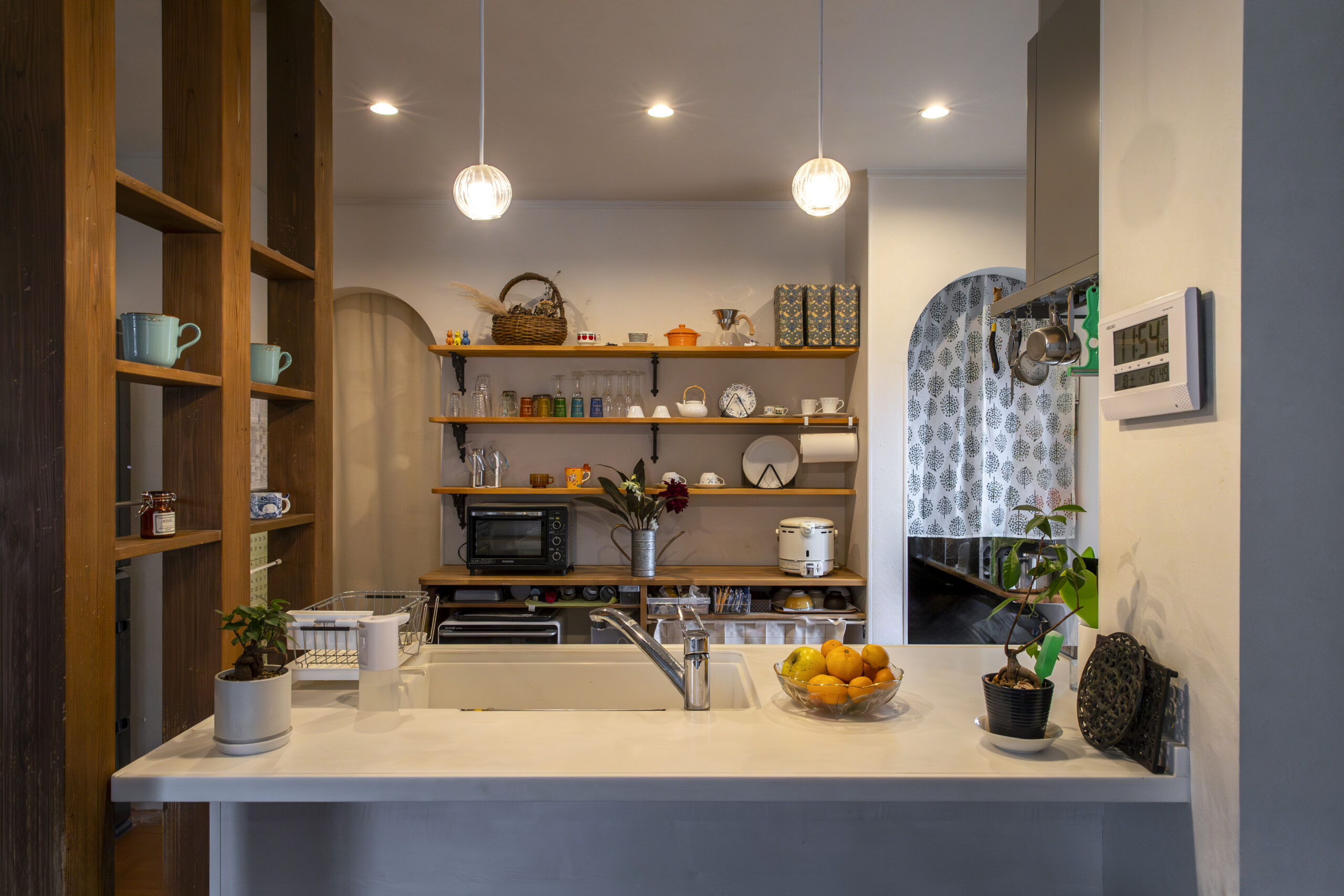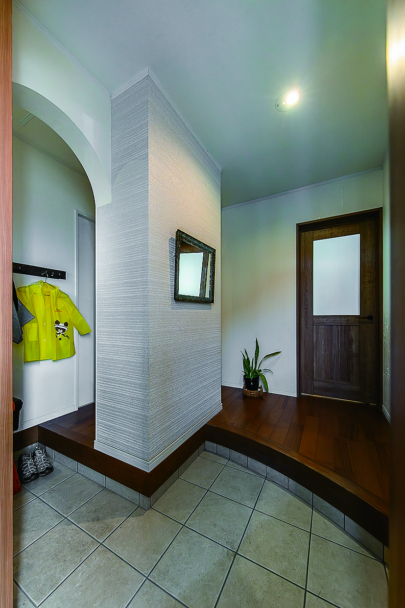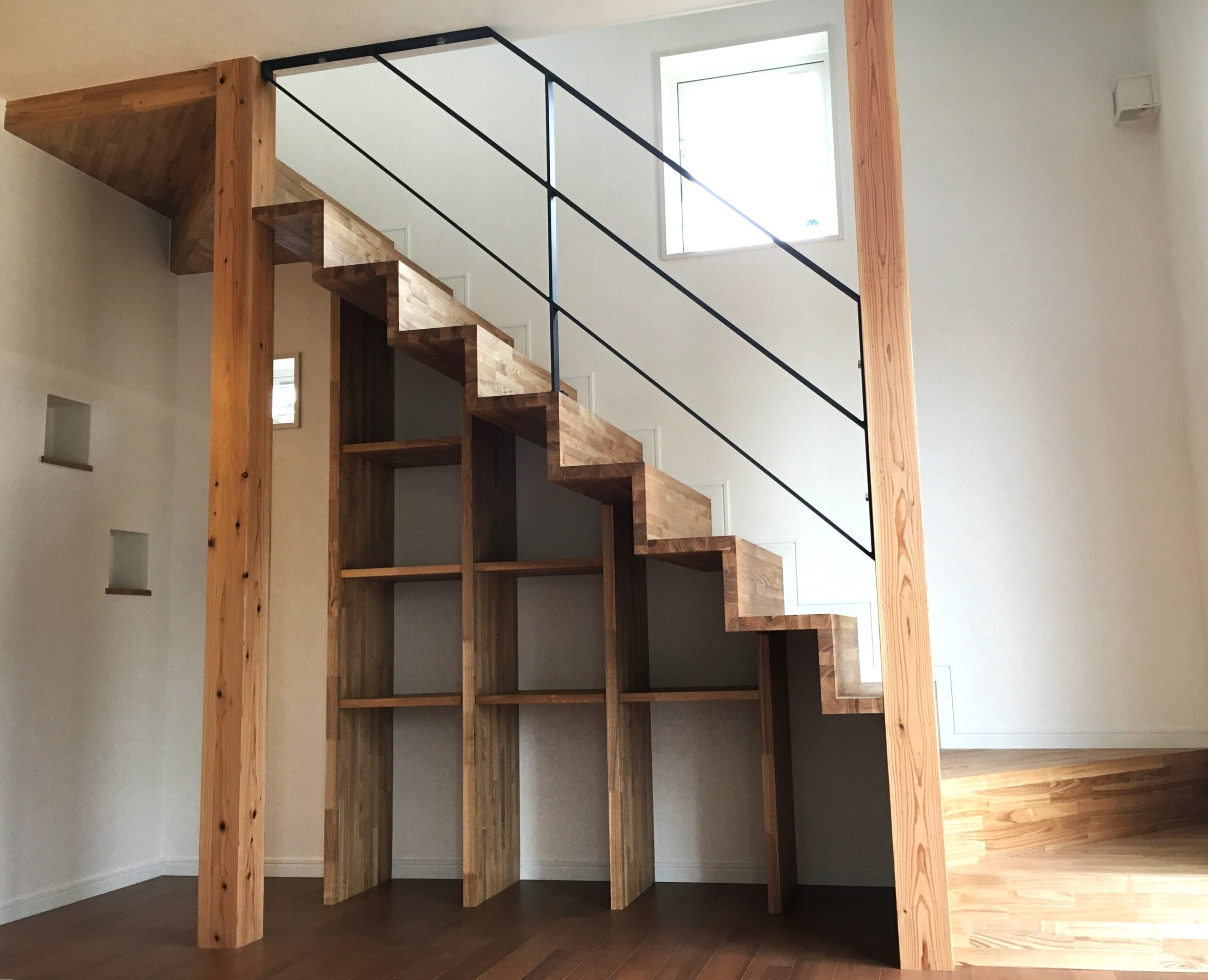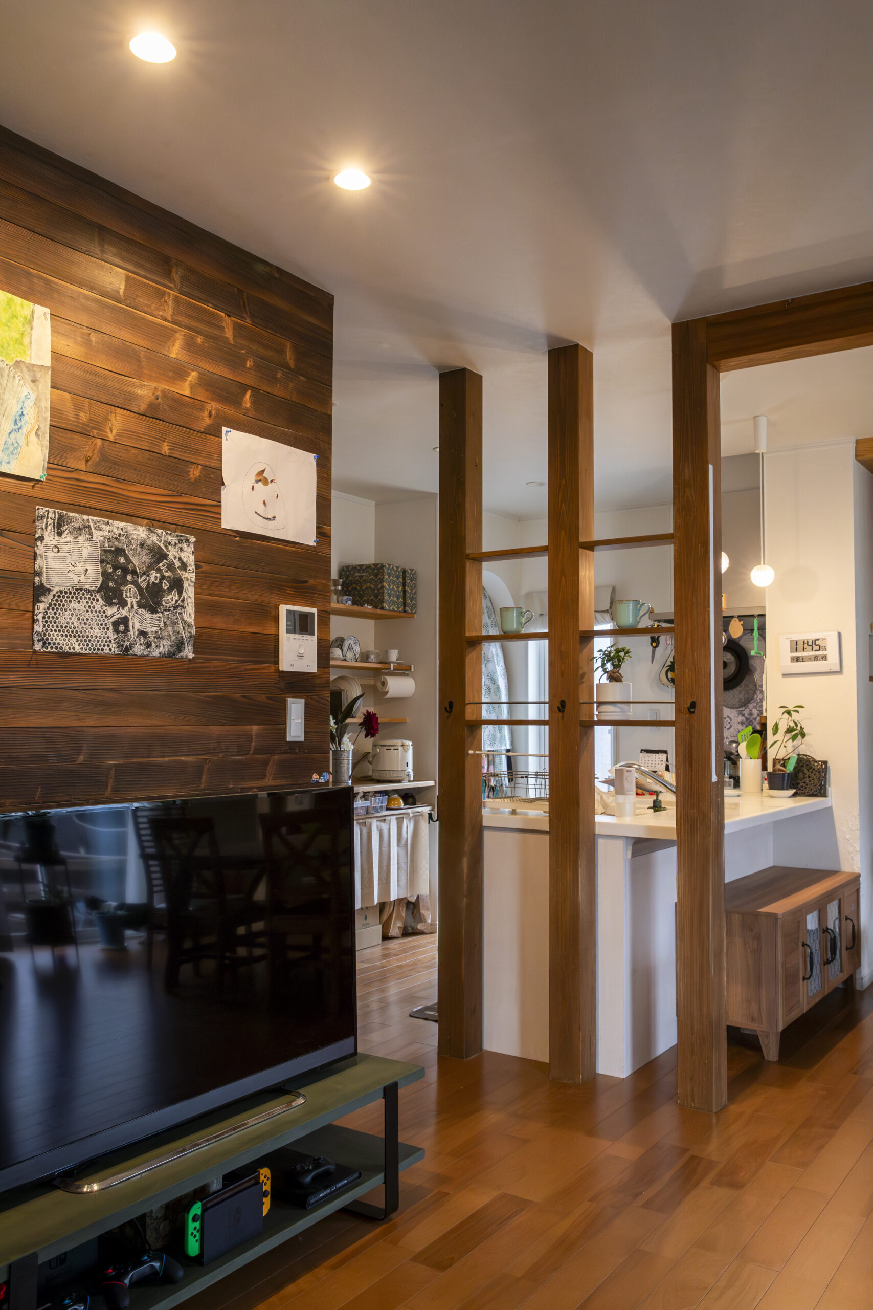 オープンな収納階段がLDKのアイコン的な存在。ここにお子様たちの勉強道具やランドセルなどが収納され、自然とリビングダイニングに家族と猫たちが集まります。木のぬくもりに包まれたお住まいは居心地が良い空間に。