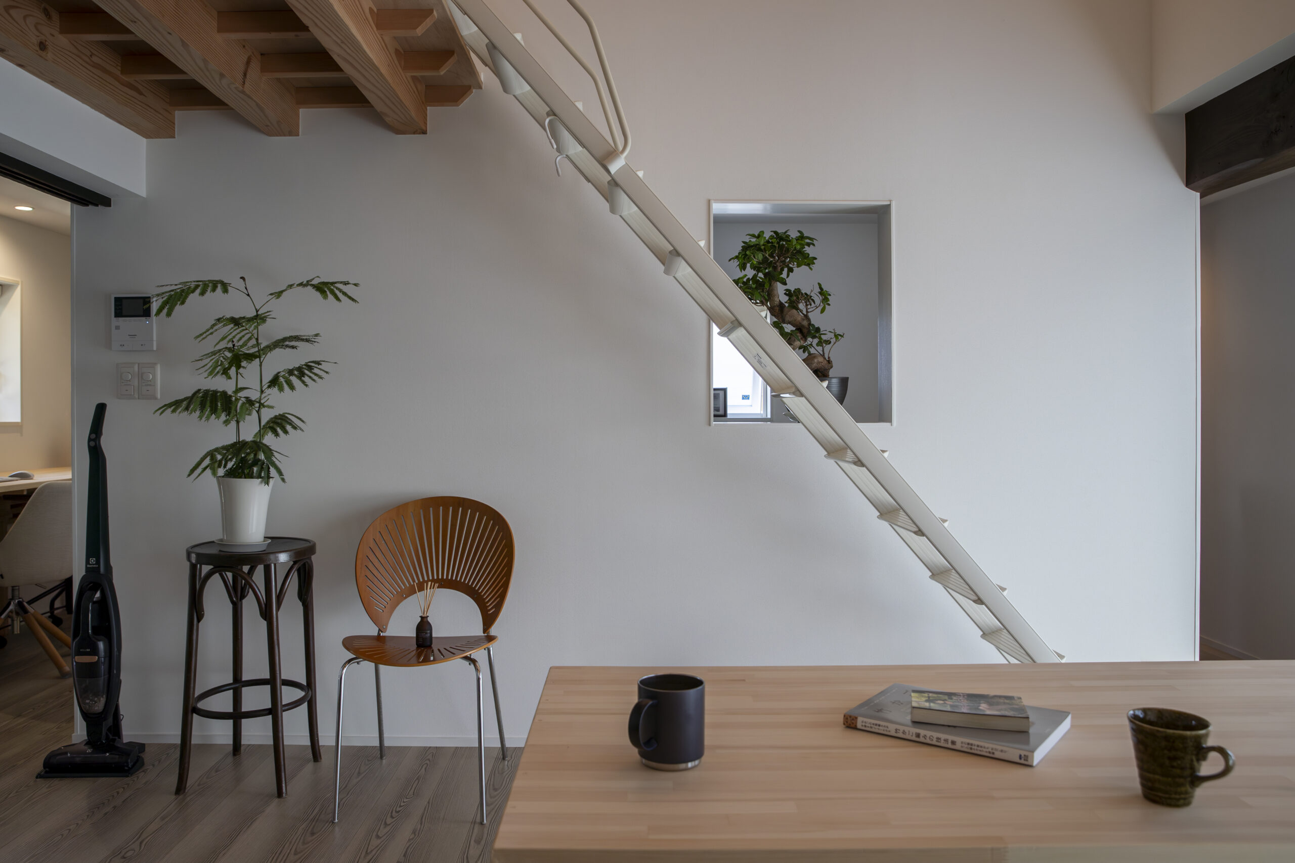リビングで団らんする家族の様子。木の温もりを感じるインテリアと階段のある空間
